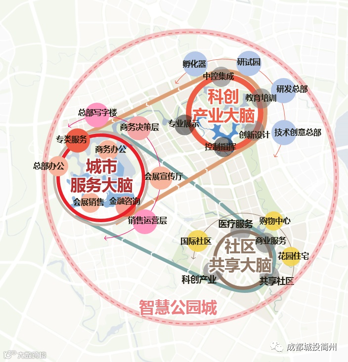 以龙马湖公园为代表的“城市服务大脑”集聚总部商务、金融服务、会展销售、重大公服设施,为片区智慧城市运营提供金融支撑、风投管理、总部决策、文化娱乐等综合服务。以龙升湖公园为代表的“科创产业大脑”集聚科技创新、教育培训、专业展示、孵化加速平台,为片区智慧城市运营提供技术服务。以龙显湖公园为代表的“社区共享大脑”集聚商业服务、教育医疗、检测产业、品质居住等功能,为片区智慧城市运营提供产业融合生活的共享设施服务。
