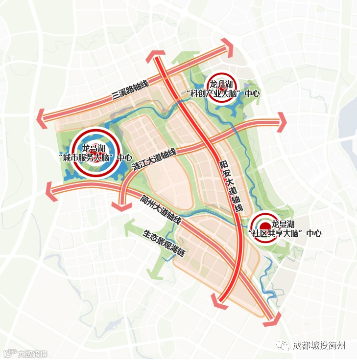 规划形成“三心一链四轴”的空间结构。“三心”为龙马湖“城市服务大脑”中心、龙升湖“科创产业大脑”中心、龙显湖“社区共享大脑”中心。“一链”为串接简州新城的生态景观湖链。“四轴”为阳安大道轴线、三溪路轴线、涟江大道轴线、简州大道轴线。