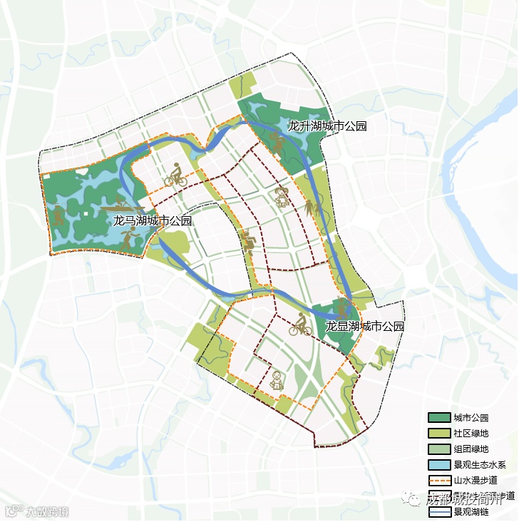 基于三湖一链绿地系统,规划形成“3+1+N”生态空间体系,打造两类慢行系统。“3+1+N”生态空间体系细分为:延续山水大格局,打造3处城市级综合公园;顺应地势,打造1条生态景观湖链;结合公园社区,打造N个节点公园。两类慢行系统分别为滨水临湖的环状山水漫步道,串接服务设施的蜀韵生活漫步道。《草案》整体形成点、线、面相结合的生态空间体系,彰显“开门见山、百米进绿、千米进园”的景观特色。