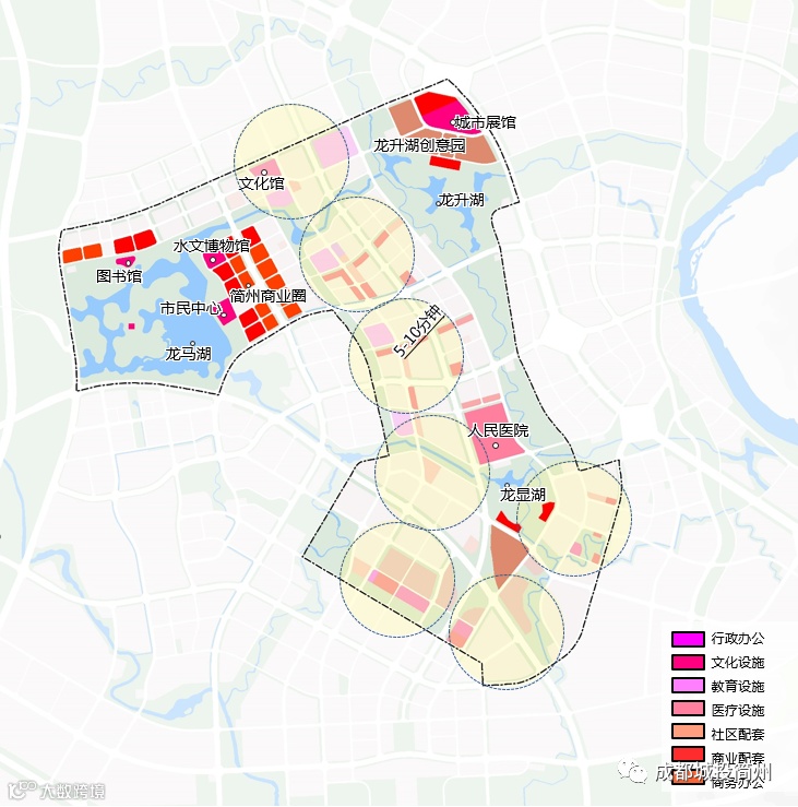 《草案》于规划范围内落实国土空间规划重大公共服务设施,包括市民中心、水文博物馆、图书馆、文化馆、城市展馆、简州商业圈和人民医院等,打造龙马湖、龙升湖、龙显湖引领的公共服务中心。以龙马湖为核心,周边布局文化、商业、商务办公等公共设施,打造龙马湖综合服务中心。以龙升湖为特色,周边布局商业文化、教育培训、科研创新、孵化办公等公共设施,打造龙升湖专业化服务中心。以龙显湖为示范,周边布局医疗、商业、教育学校、创新产业和品质居住等功能,打造龙显湖社区共享服务中心。同时,完善5-10分钟生活圈基本配套。以5-10分钟生活圈为单元,合理配套基本医疗、教育、文化、体育、商业、办公等公共服务设施,为市民提供创新高效品质社区。