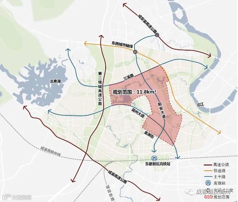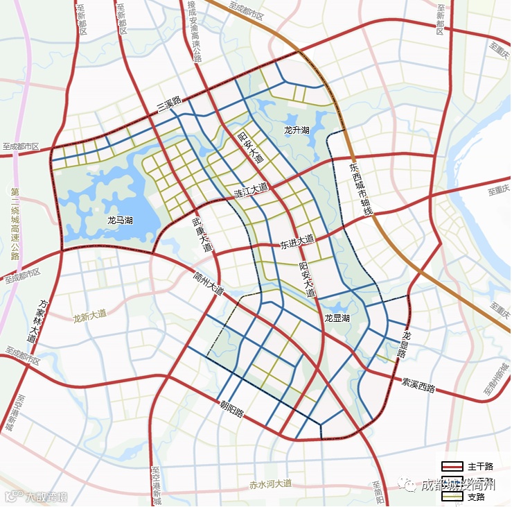 “一快”为东西城市轴线。“五横”为三溪路、涟江大道、东进大道、索溪西路、简州大道。“四纵”为方家林大道、武康大道、阳安大道、朝阳路-龙显路。规划通过东西城市轴线快速联系成都市区,主干道联系周边区域组团,以快速路和主干道形成“一快五横四纵”的路网结构,强化区域联系,明晰路网结构。