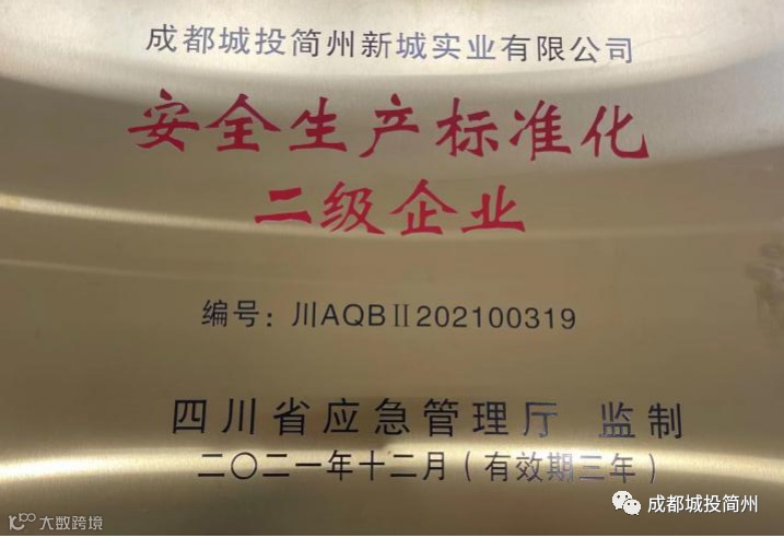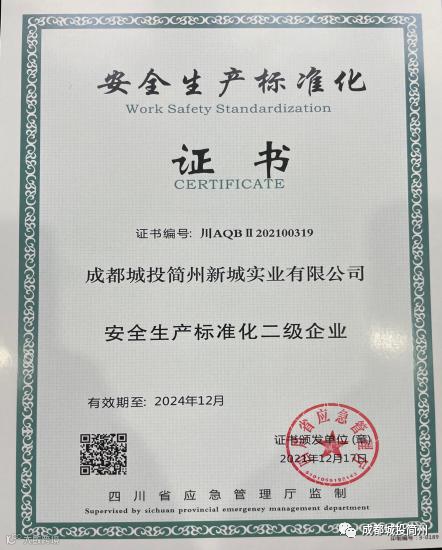 近日,城投简州公司通过扎实开展安全生产管理制度建设、安全教育培训、安全生产检查、隐患排查和治理、应急演练等13个方面工作,持续改进和提升公司安全生产标准化水平,于2021年12月获得四川省应急管理厅颁发的“安全生产标准化二级企业”证书。