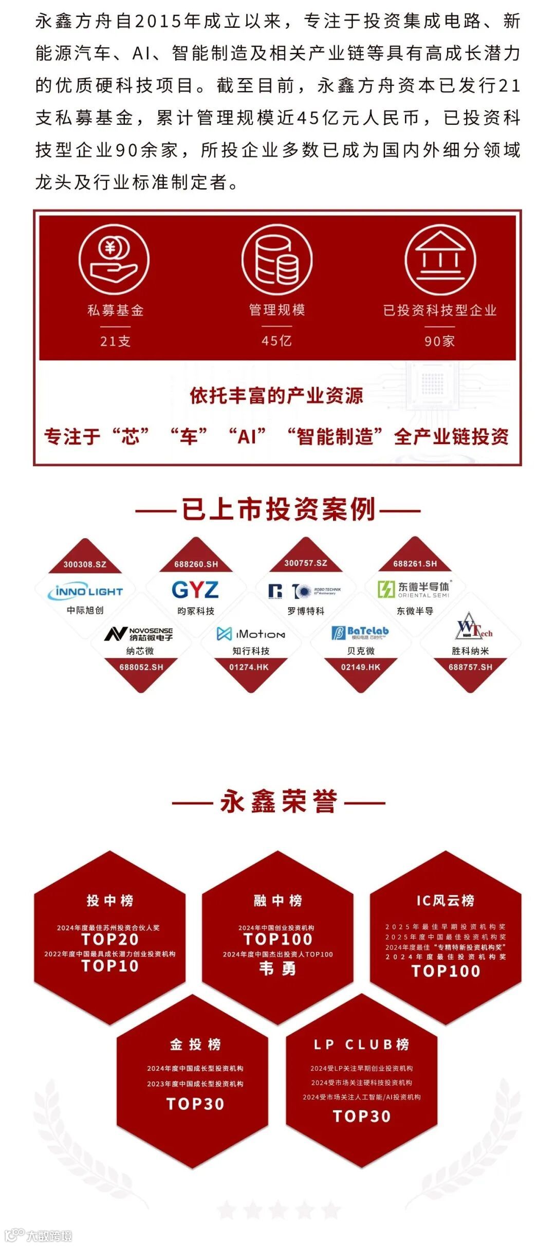 永鑫方舟资本自成立以来,专注于投资“芯”、“车”、“AI”、“智能制造”等具有高成长潜力的优质硬科技项目,其中已上市企业8家:中际旭创、昀冢科技、罗博特科、东微半导、纳芯微、知行科技、贝克微、胜科纳米。