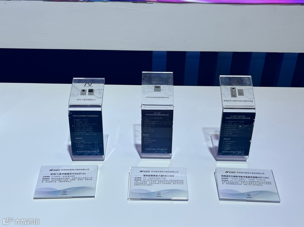 纳芯微(科创板股票代码688052)是高性能高可靠性模拟及混合信号芯片公司。自2013年成立以来,公司聚焦传感器、信号链、电源管理三大方向,为汽车、工业、信息通讯及消费电子等领域提供丰富的半导体产品及解决方案。本次展会上,纳芯微展出了双向IC数字隔离芯片、增强型隔离放大器以及高精度双引脚数字脉冲温度传感器产品。其中,双向IC数字隔离芯片,提供双通道的双向隔离,可直接对接大多数MCU等数字接口,具备高电磁抗干扰度、低辐射、速度快、隔离电压高等优点。纳芯微展出的增强型隔离放大器,基于电容隔离技术,已成功应用在汇川的变频器、联合汽车电子新能源汽车OBC系统中。