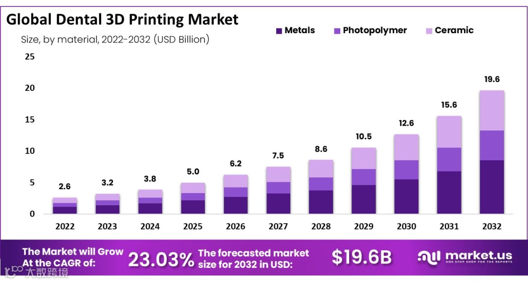 根据Market us预测,2024年全球齿科3D打印市场规模约为227亿人民币,其中金属类占比约为40%,对应90.8亿人民币市场规模。根据永鑫预测,目前国内齿科设备市场需求约10000台。按照单台机器平均价格12万元计算,所对应市场规模为12亿元。据访谈,国内义齿加工中心3D打印渗透率为45%左右,对应国内可触及市场空间为6.6亿元人民币。此外,海外市场齿科3D打印设备需求量为数万台,对应海内外总市场空间在30-40亿元人民币。