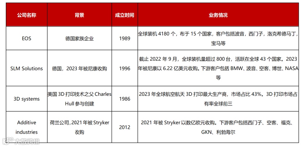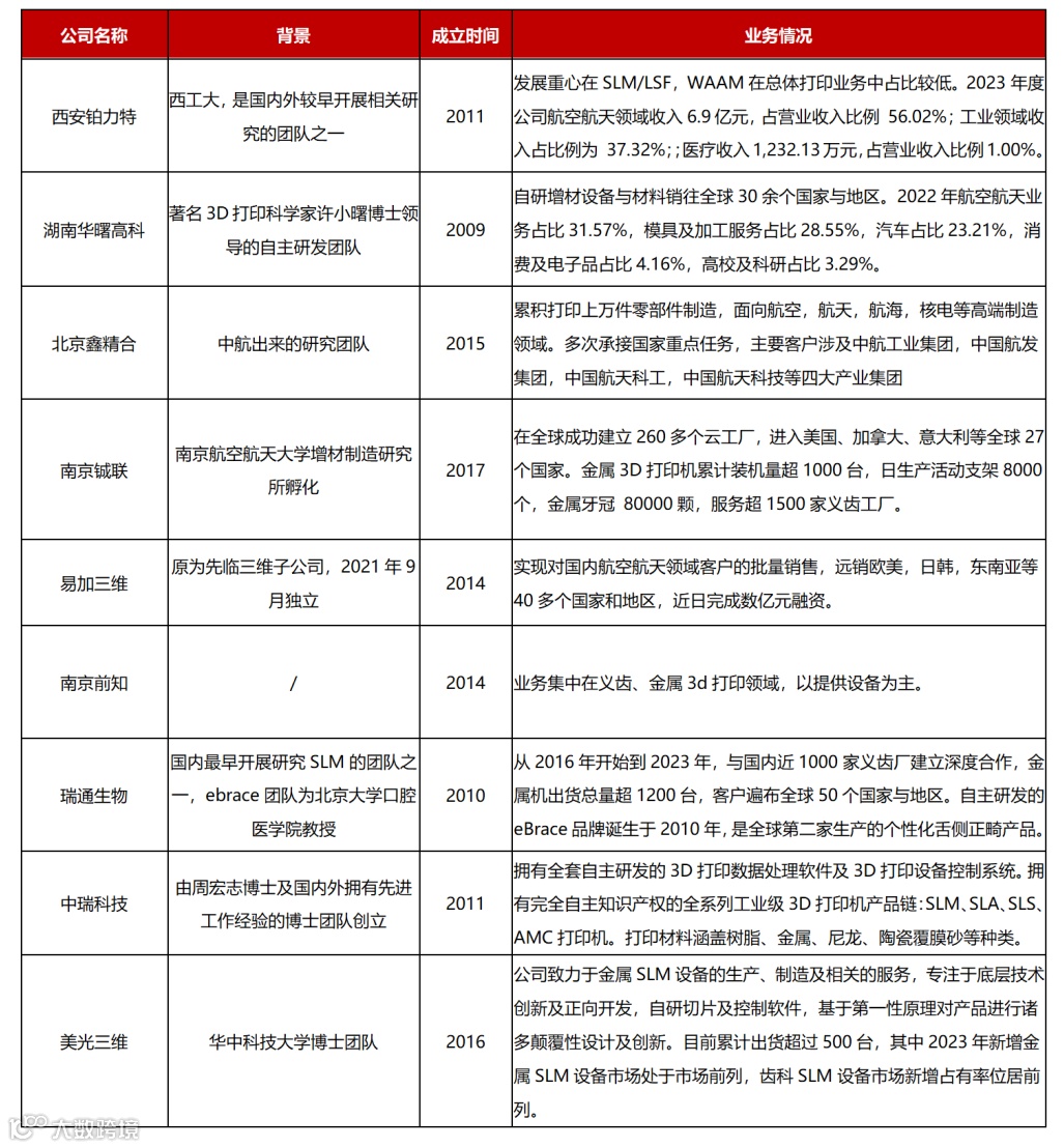 金属3D打印市场玩家众多,市场竞争较为激烈。目前国内此类上市公司有铂力特和华曙高科,业务主要聚焦于航空航天领域。以下是永鑫整理的行业主要玩家情况。