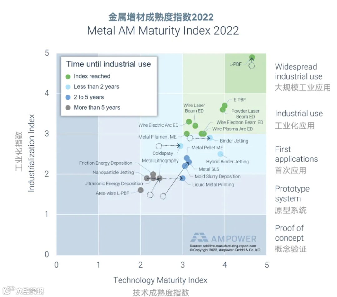 金属增材制造技术当中,目前最成熟的是PBF和DED两种。其中PBF达到5级成熟度,DED达到4级成熟度。通常,技术成熟度首先增加,工业化随之而来。目前PBF已在航空航天、军工、鞋模以及齿科等行业大规模应用,而DED则是有潜力实现工业化应用,应用场景有待进一步开拓。