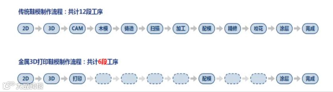 3D打印相比传统鞋模制造具有显著的优势。传统鞋模制造具有以下特点:1)流程成本高、周期长:需要经历CNC加工、硅胶模、石膏模、铸造金属模、化学腐蚀咬花、涂层等多道工艺步骤;整个的开模周期大致在15-20天;2)化学腐蚀咬花:咬花过程需要酸腐蚀,带来一系列环保问题;3)人工的依赖程度较高:鞋模制造技艺往往依靠经验积累和师徒传承,人力成本更高且经验丰富师傅数量少。