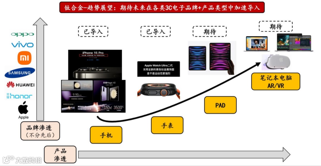 苹果从Ultra系列手表开始标配钛合金表壳,发布的iPhone15 Pro版本也开始使用钛合金中框。华为在2022年发布的折叠屏手机Mate Xs 2结构件中采用钛合金材料,并在Watch 4 Pro中使用了钛合金边框。钛合金兼具高强度和轻量化特性,然而钛合金加工难度大,对工艺有较高要求, 3D打印与钛合金的结合已成为产业发展的新趋势。