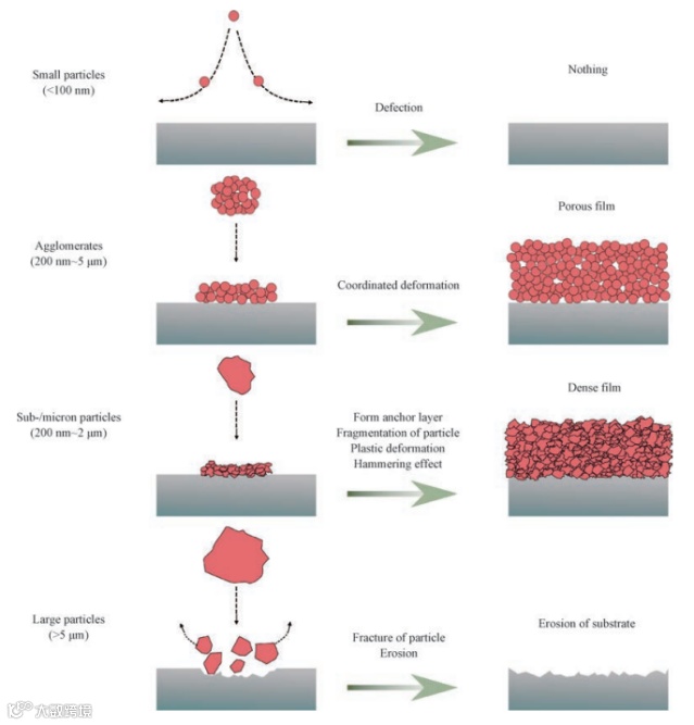 AD法对粉体的要求高,为了实现AD喷涂高质量、大面积的涂层制备,需要均匀分散的固体颗粒。在粉体材料上,AD法采用粒径范围为数十纳米至几微米的粉末原料,从而实现减少孔隙率,获得更致密的涂层。但是该粒径范围的粉末颗粒具有较高的表面能,受表面静电和范德华力作用的影响,容易发生团聚形成软团聚颗粒,很少以单个颗粒的形式存在。因此需要气溶胶发生器将粉体分散开来。随着技术演进,目前半导体行业使用造粒后的粒状颗粒代替亚微米颗粒作为喷涂粉末。但是该方法也导致对陶瓷粉体原材的要求更高。
