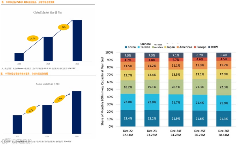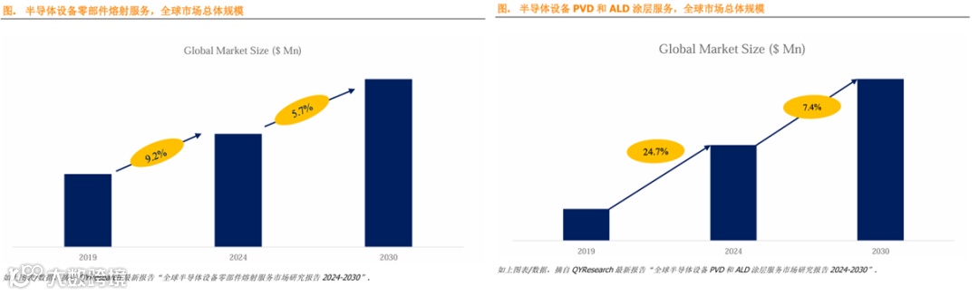 2)据QYResearch显示, 2024年全球半导体设备零部件PVD和ALD涂层服务市场规模为0.59亿美金(约4.13亿人民币),预计2030年全球半导体设备PVD和ALD涂层服务市场规模将达到0.9亿美元(约6.3亿人民币),未来几年年复合增长率CAGR为7.4%。