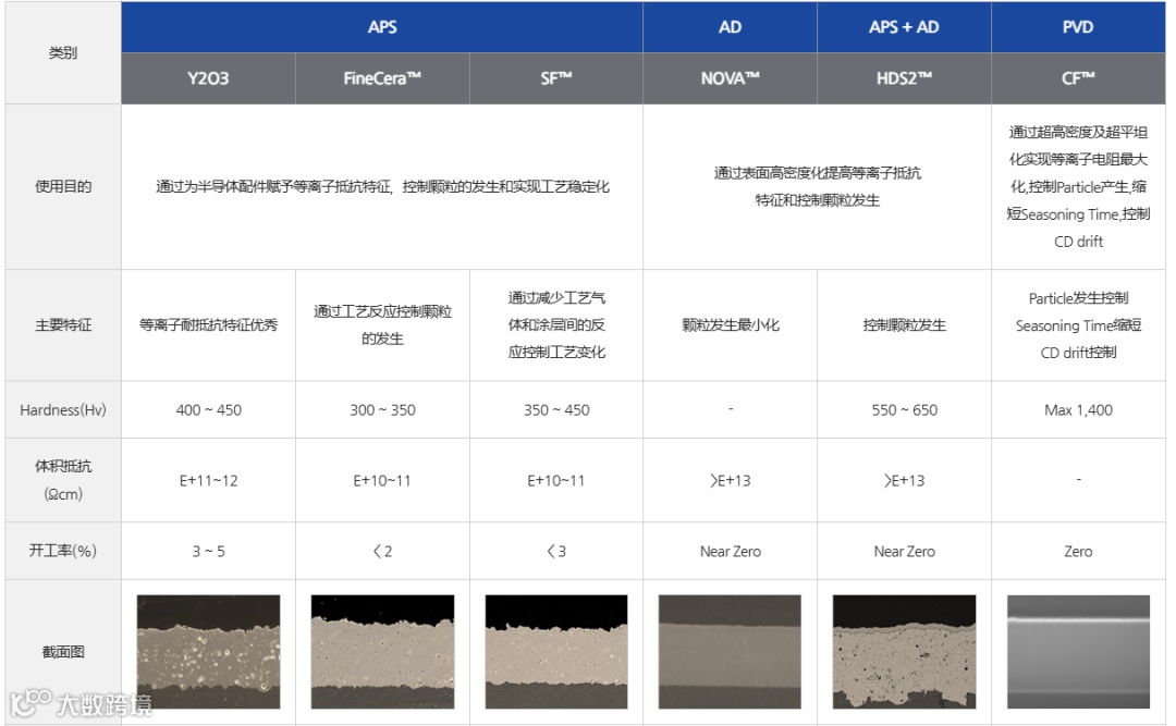 此外,比较常见的特征,比如颜色(一般跟材料颜色直接相关,PS涂层下氧化铝、氧化钇是白色,YAG、氟化钇、氟氧化钇是象牙色;AD涂层下氧化钇是透明色或者白色;PVD下,氧化钇和氟氧化钇是透明色或白色),耐等离子体性(PVD、AD、SPS的性能都非常好,APS相对弱一些,其中APS中又根据材料不同而不同,一般氟化钇、氟氧化钇、YAG为佳,氧化钇效果次之,氧化铝效果一般)。