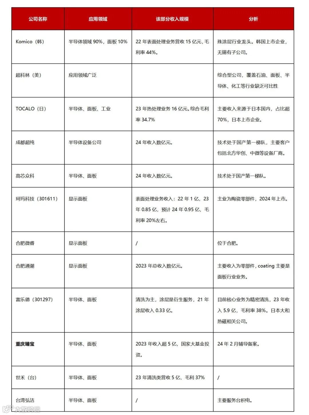 1)参考珂玛招股书,2021年显示面板设备表面处理市场的市场规模约为21亿元。但本土企业服务份额已经超过50% 。