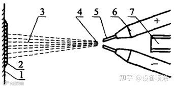 (1-工件;2-涂层;3-喷涂束;4-电弧;5-喷涂丝材;6-导电嘴;7-压缩空气喷嘴)