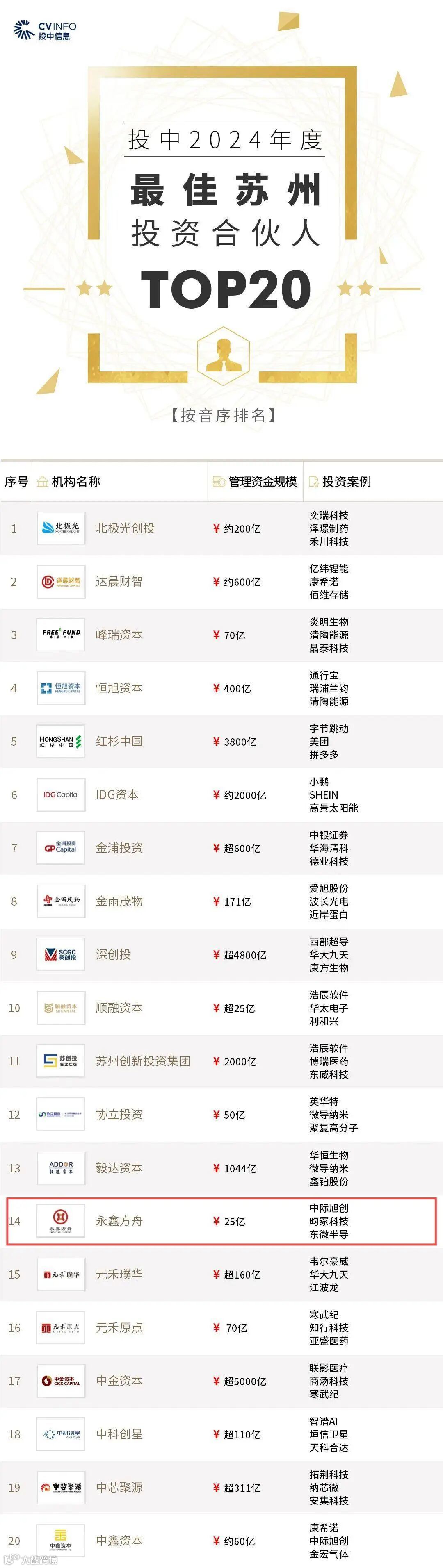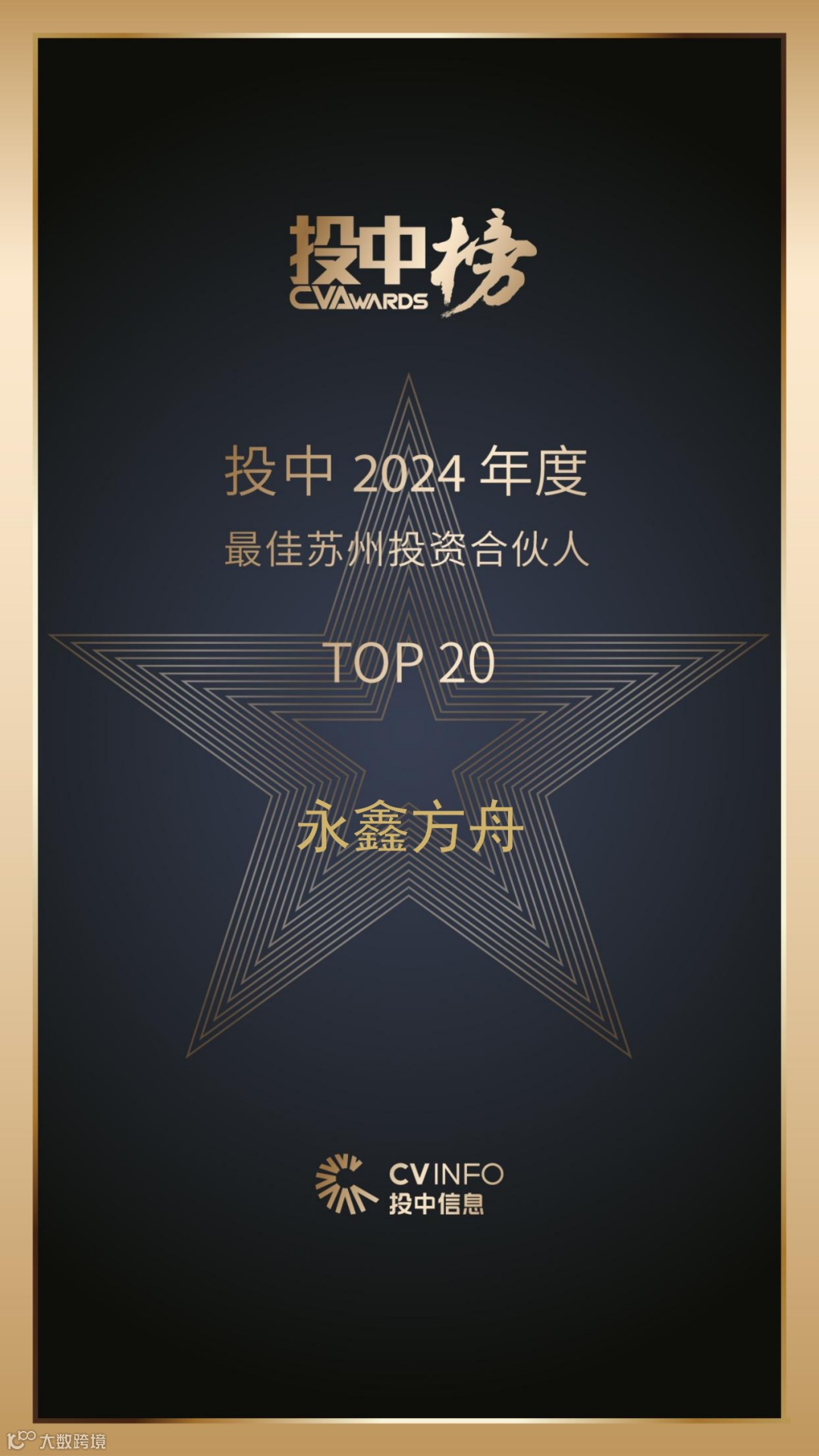 永鑫方舟荣登「投中2024年度最佳苏州投资合伙人TOP 20」。