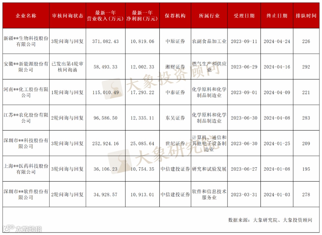 据大象君统计,处于3轮问询与回复的终止企业数量最多,有3家;处于2轮问询与回复的有2家;1轮问询与回复的有1家;1家企业已发出第4轮审核问询函。