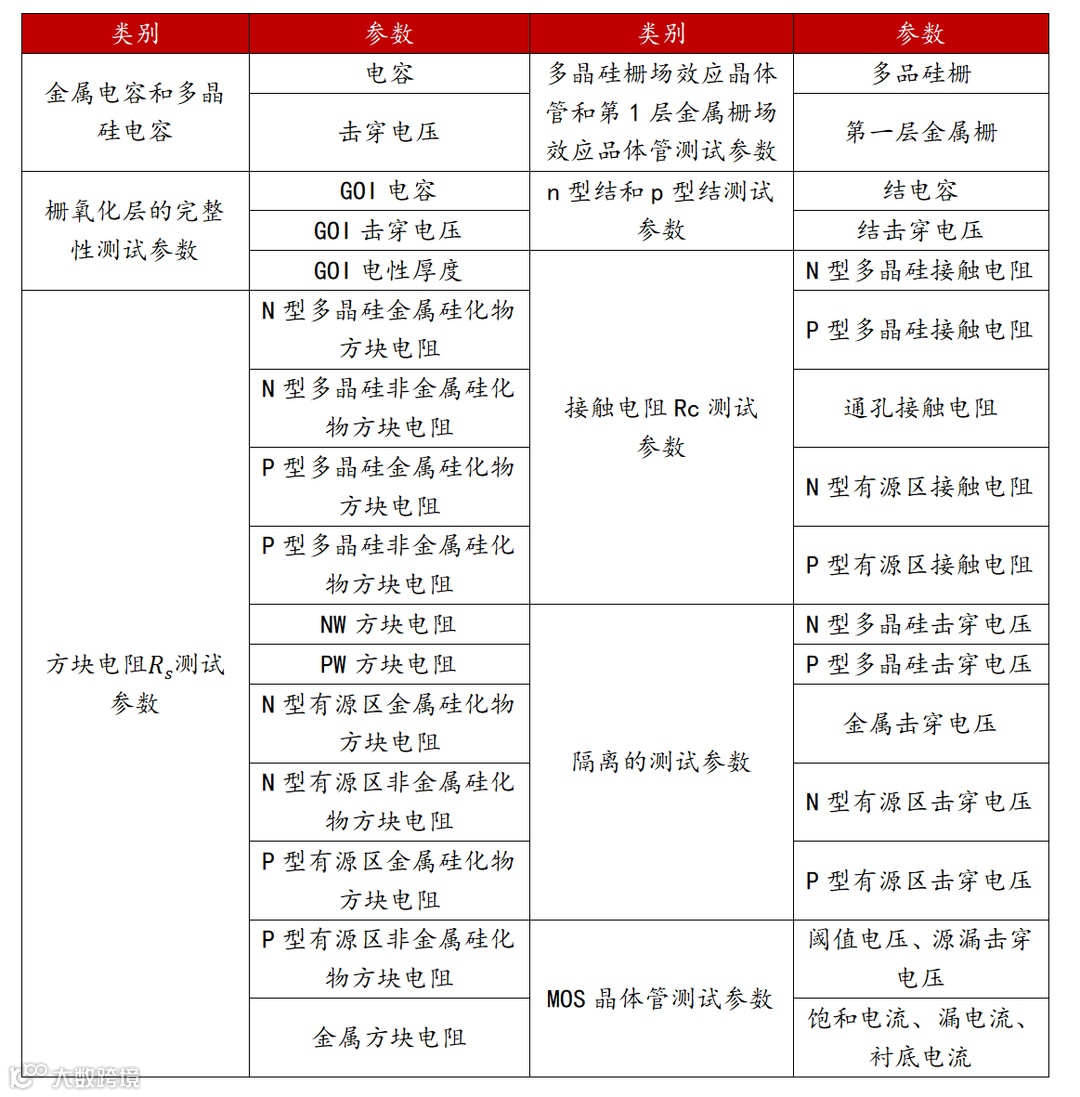 WAT测试的参数一般分为工艺部分和器件部分(有源器件、无源器件)的电学特性参数。