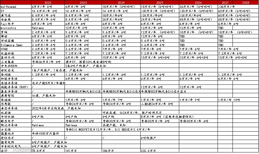 1) 表格中未特别说明晶圆厂,均指硅基晶圆厂,其产能等效8英吋产能(其中80%以上产能增量来自于12英吋);SiC晶圆均等效为6英吋产能(目前SiC新增产能正在向8英吋迈进);