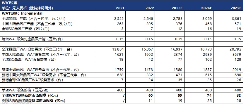 2) 由于WAT测试主要是测试测试芯片,所以对于SiC和Si基晶圆的测试速度一般是20分钟/片(此处指串行WAT测试机速度;并行WAT同时需要测试的数据更多,可能会更慢),对应2100片/月,但是一般晶圆厂很难一直满负荷运行,所以此表取1500片/月;
