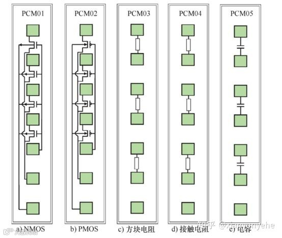 图9 常见的测试芯片示意图(绿色为焊盘)及相关测试参数