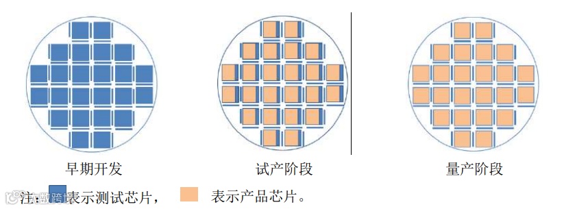 为了确定最优的制造工艺或寻找影响成品率的因素,需要对各种电学结构和关键器件进行电学性能的检测,提供寻找影响成品率因素的有效线索。由于产品芯片结构过于复杂,在产品芯片上直接进行电性测试难以分解发现产生问题的根本原因,因此一般效率不高。为了降低制造成本、提升效率,业内通常采用测试芯片替代产品芯片进行电性测试,相比产品芯片,由于测试芯片将工艺成品率风险拆解到各自独立的结构中,能够直接找到需要改进的风险点。