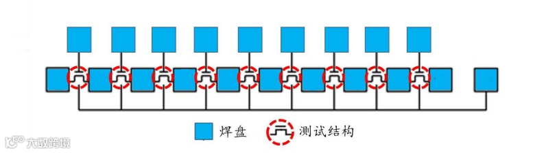 测试结构(尺寸:纳米级)是测试芯片中待测的器件,焊盘(尺寸:几十微米)是连接测试芯片和提供与电性测试设备连接的标准金属接触点阵列,而外围电路连接测试结构和焊盘,通过电路实现测试选择、控制和电学信号的传递。