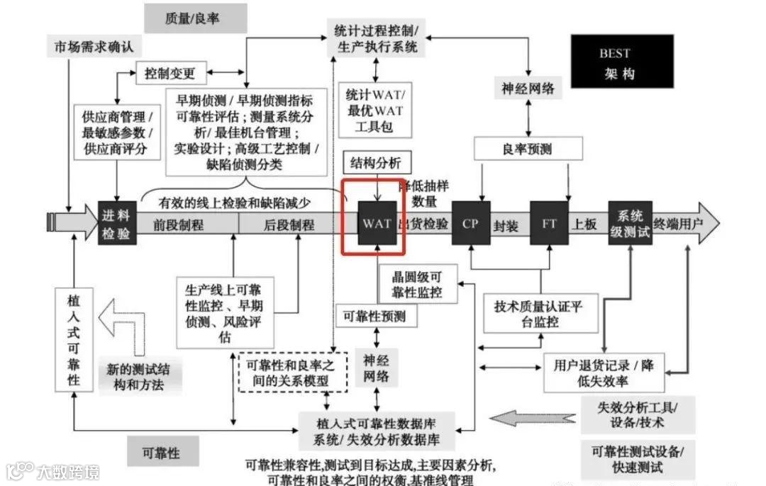 在芯片制造过程中,主要流程包括:进料检验(IQA)→晶圆前段工艺(FEOL)监控→晶圆后道工艺(BEOL)监控→晶圆验收测试(WAT)→晶圆出货检验(OQA)→晶圆良率测试(CP)→芯片封装工艺监控→芯片最终测试(FT)→芯片上板工艺监控(On-board Test)→系统级测试(SLT)和终端用户使用。