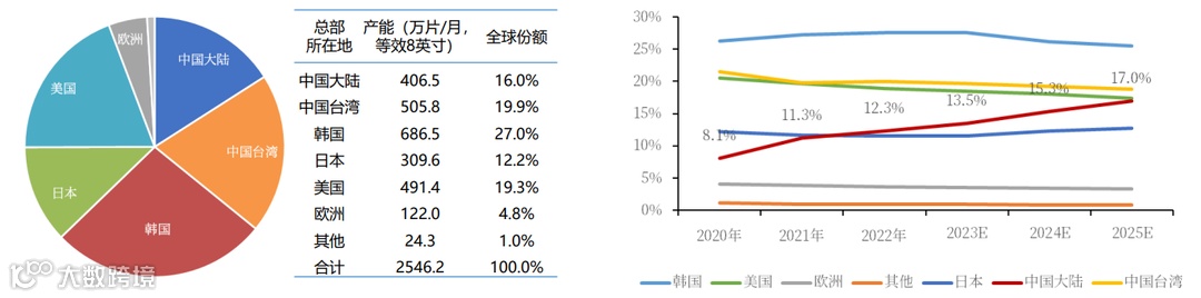 2022年中国大陆公司(以公司总部所在地区划分)产能406.5万片/月,占全球产能16.0%(剔除二极管等低端产能的话,等效305万片/月,占比12.3%),位居世界第四。