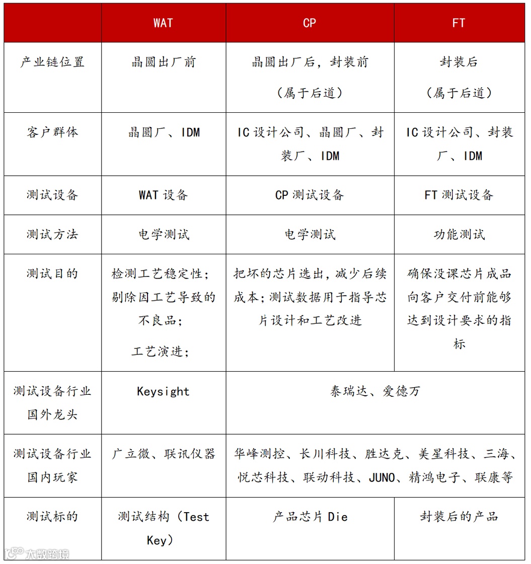 在晶圆厂制造晶圆的过程中,为了判断该生产工艺的良率,需要使用WAT设备对提前设计好的测试结构(Test Key)进行电性能测试,判断生产的成品情况,淘汰因工艺导致的不良片,保证交付给客户的晶圆良率,并将测试结果反馈给良率提升系统,进行工艺的优化。晶圆在制造流程中需要经过多轮测试,包括WAT、CP和FT等,其中,WAT属于晶圆出厂前的测试。