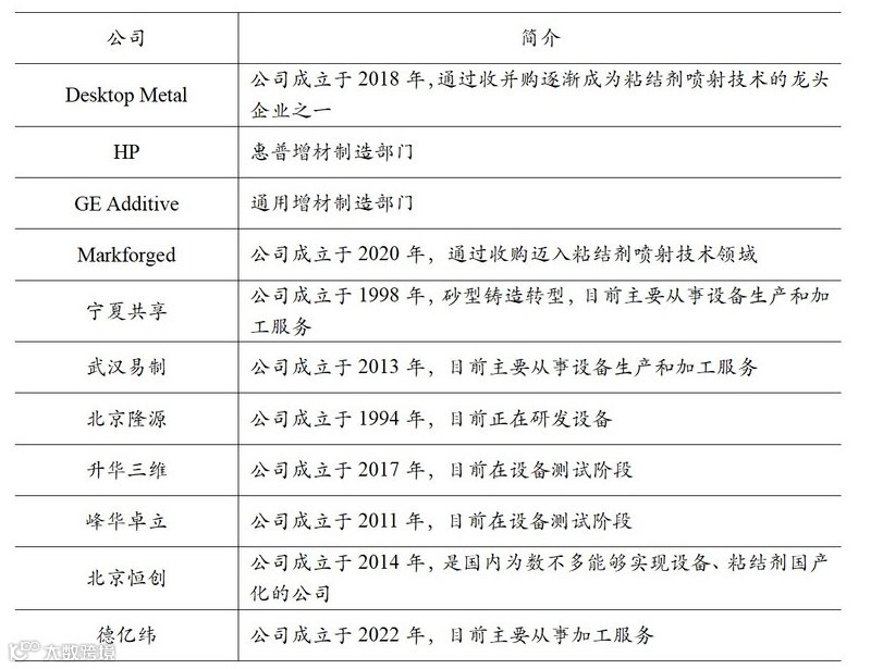 目前国外公司主要有Desktop Metal、HP、GE Additive和Markforged,国内设备公司主要有宁夏共享、武汉易制和北京恒创,服务商主要有德亿纬等。国内公司又主要分为技术转型类企业(如宁夏共享、升华三维和峰华卓立等)和专一技术类企业(如武汉易制和北京恒创等)。