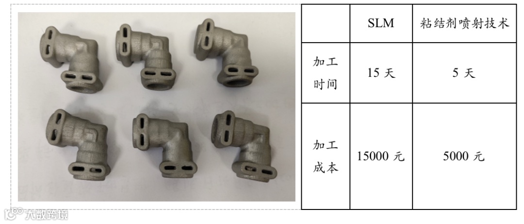 根据北京恒创打印某一复杂接管结果(以1000件为例,30克/件为例),粘结剂喷射技术的打印速度可达SLM的3倍以上,设备及原材料成本是SLM的1/3,粘结剂喷射技术在打印速度、成本方面具有较大优势,具备大批量民用化的可能。