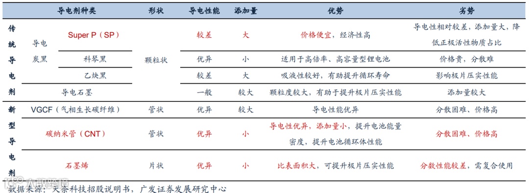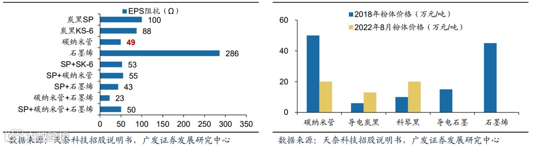 新型导电剂较传统炭黑:(1)性能优势(2)添加量小,(3)单价较高。天奈科技招股说明书数据如下[6]: