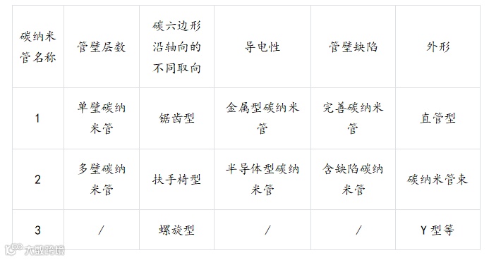 碳纳米管(Carbon NanoTubes, CNT),又名巴基管,是一种具有特殊结构的一维量子材料。20世纪90年代日本科学家Lijima先生通过透射式电子显微镜观察到石墨在电弧作用下的灰状产品才正式命名它们为碳纳米管。碳纳米管主要由单层或多层石墨片绕中心按一定角度卷曲而成的同轴中空无缝管状结构,其管壁大都是由六边形碳原子网格组成。外观呈黑色粉末状,无味。碳纳米管的分类方式如下表所示。