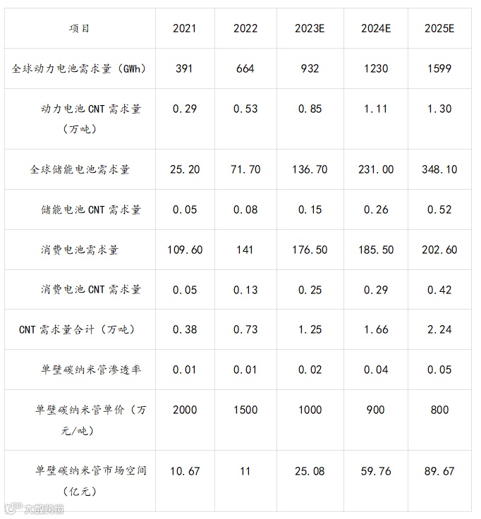 表8 碳纳米管和单壁碳管粉体的市场空间预测
