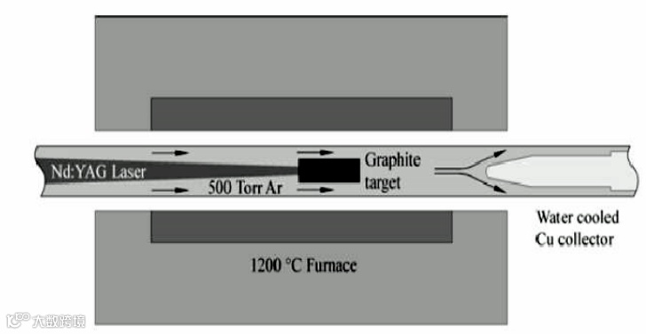 激光蒸发制备单壁碳纳米管的方法是将金属催化剂和石墨混合的石墨靶放置 在一个加热炉中。当炉温升到1200摄氏度,向管内充入惰性气体,用一束激光照射石墨靶,石墨靶在照射下生成了气态碳,它们和催化剂粒子 因气流被从高温区带到低温区,在催化剂的作用下生成单壁碳纳米管。激光烧蚀法可以得到质量较高的产品,但这种方法制备出的产品产量比较低,成本比较高,不利于广泛应用。