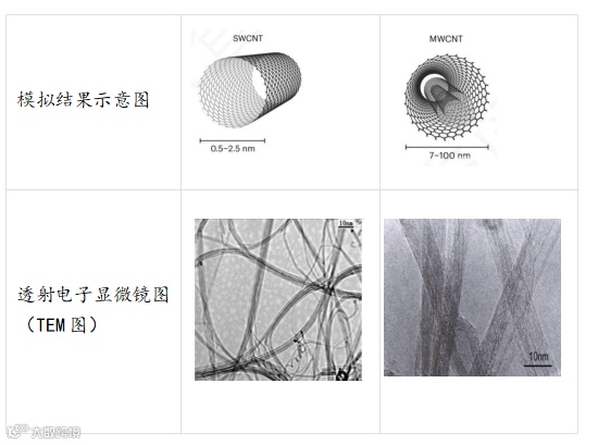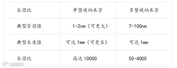 单壁碳纳米管(SWCNT)由一层石墨烯片组成,也称为石墨烯纳米管(GNT),单壁管典型的直径和长度分别为0.75-3nm和1-50um。多壁碳纳米管含有多层石墨烯片,形状像个同轴电缆,其层数从2-50不等,层间距为0.34nm左右,与石墨层间距相当。多壁管的典型直径和长度分别为2-30nm和0.1-50um。