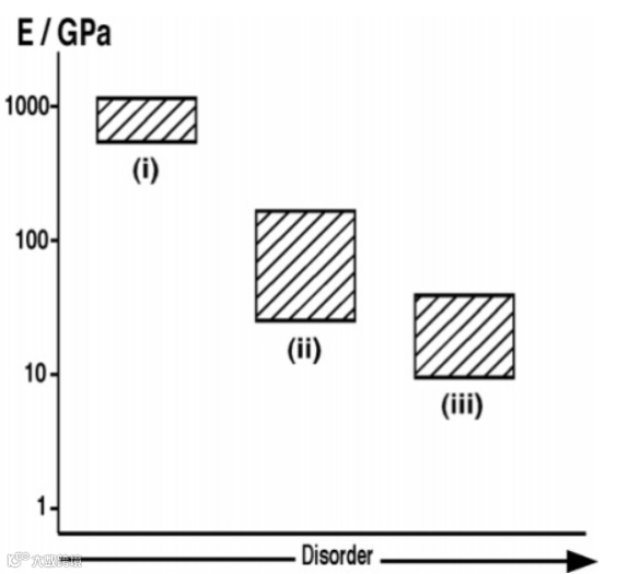 1)单壁碳纳米管的杨氏模量,几乎比多壁碳纳米管高一个数量级。其中(i) 单壁碳纳米管(SWCNT);(ii)和(iii) 多壁碳纳米管(MWCNT),分别在720℃和900℃下通过化学气相沉积法(CVD)合成[3]。