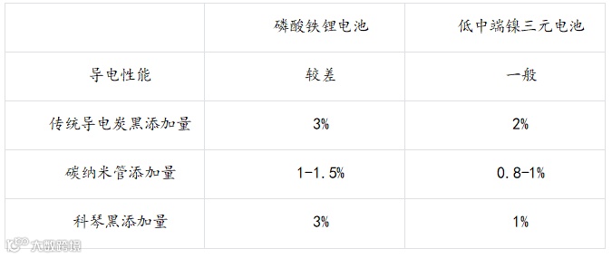 综合考虑性能和成本,产业链现多采用新型传统复合导电浆料,如SP+碳纳米管、碳纳米管+石墨烯、SP+碳纳米管+石墨烯等。目前锂电池市场主要包括磷酸铁锂电池和低中端镍三元电池。