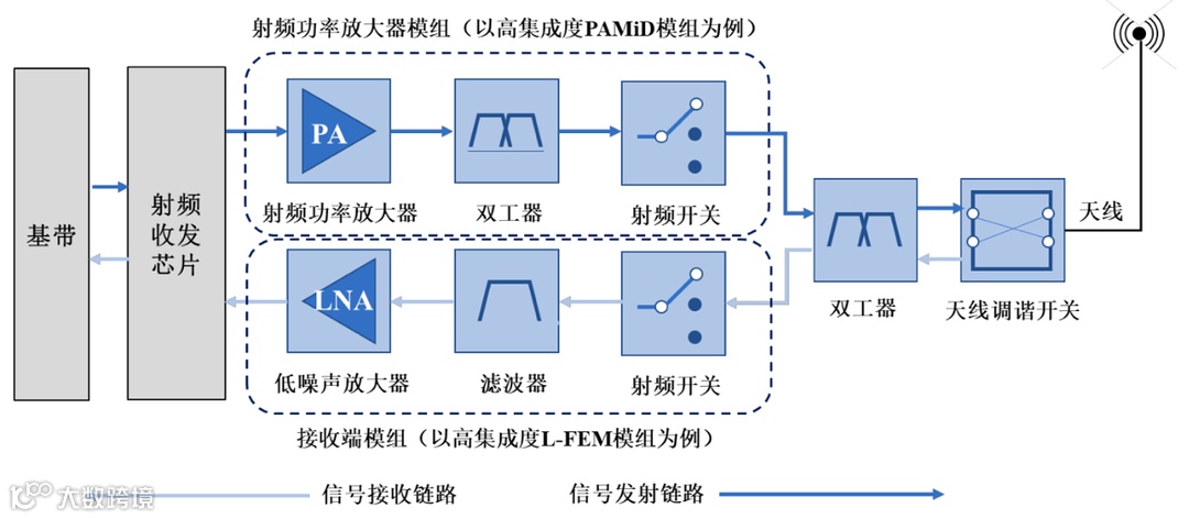 射频前端模块指位于射频收发器及天线之间的中间模块,是实现无线电磁波信号的发送和接收的核心。射频前端一般包括功率放大器(PA, PowerAmplifier)、双工器(Duplexer)、射频开关(Switch)、滤波器(Filter)、低噪放大器(LNA, LowNoiseAmplifier)等。射频开关用于实现射频信号接收与发射的切换、不同频段间的切换;射频低噪声放大器用于实现接收通道的射频信号放大;射频功率放大器用于实现发射通道的射频信号放大;射频滤波器用于保留特定频段内的信号,而将特定频段外的信号滤除; 双工器用于将发射和接收信号的隔离,保证接收和发射在共用同一天线的情况下能正常工作。