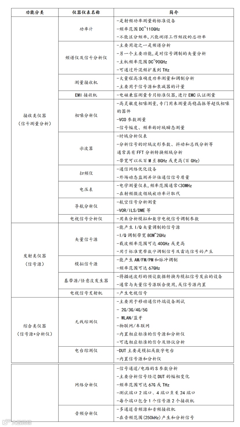 根据测试功能的不同,射频测试仪器可分为三类:接收类仪器、发射类仪器和综合类仪器。具体的仪器功能和简介如下表所示: