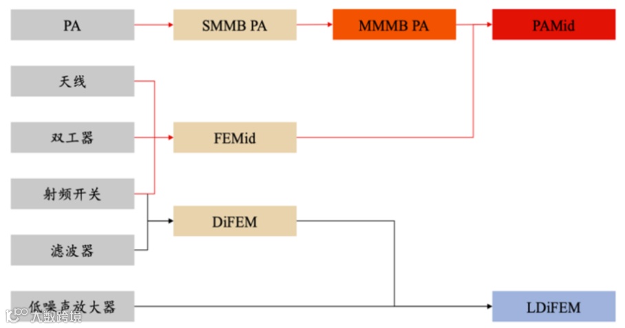 常用的模组方案包括 DiFEM(集成射频开关、滤波器)、LDiFEM(集成射频开关、滤波器和低噪声放大器)、 FEMid(集成射频开关、天线、双工器)和 PAMid(集成 FEMiD、MMMD PA)等,目前已使用在高端智能手机中,并不断向物联网、车联网等应用领域发展。