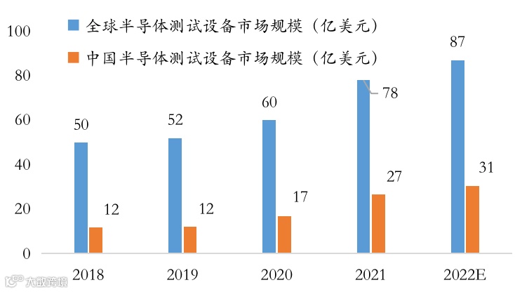 根据SEMI数据,2021年全球半导体测试设备增长29.6%至78亿美元,预计2022年将继续增长12%至87亿美元。2021年中国大陆半导体测试设备市场规模约22亿美元,假设中国测试设备在中国半导体设备中市场规模占比稳定在9%,预计2022年中国半导体测试设备市场规模将增长为30.5亿美元。