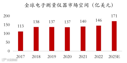 根据FROST&SULLIVAN数据,2022年全球电子测量仪器市场规模为146亿美元,预计到2025年将增长为171亿美元;2022年中国电子测量仪器市场规模为53亿美元,预计到2025年将增长为66亿美元;其中通用型约占电测仪器总市场 60%,2022年市场规模32亿美元。从产品市场结构来看,射频类仪器在通用电子测量仪器领域的市场份额达到23%,2022年市场规模为7.36亿美元(约50亿人民币)。