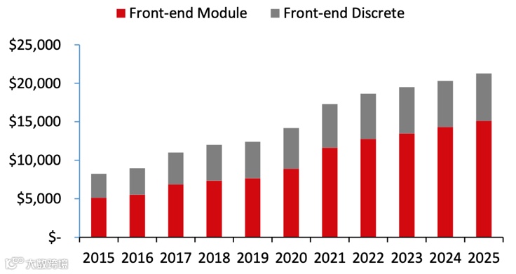 另外,分立器件与射频模组将会长期共存,共享整个射频前端市场。虽然大部分射频前端的增长将来自射频模组,但分立器件仍将占据很大一部分市场份额。2021-2026年,射频模组的年均复合增长率有望达到6%。