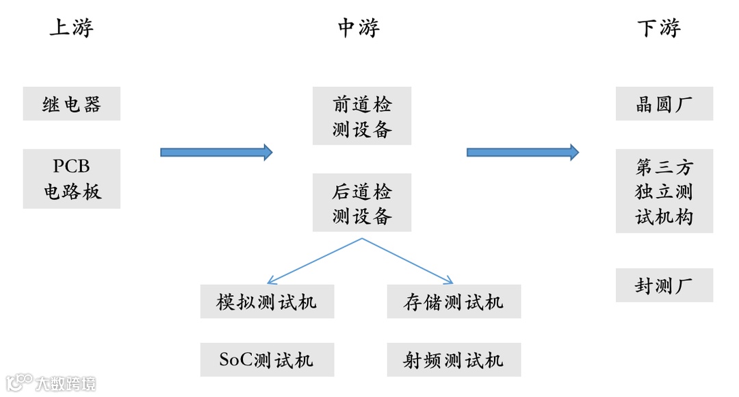 射频测试机隶属于半导体测试设备。半导体测试设备产业链,上游是继电器和PCB电路板等元器件,中游是前道检测设备和后道检测设备,下游是晶圆厂、第三方独立测试厂和封测厂等。