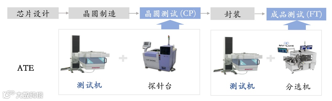 半导体自动化测试设备 (Automatic Test Equipment, ATE) ,主要包括测试机、探针台和分选机,是晶圆测试(Chip Probing, CP)和成品测试(Final Test, FT)的核心设备。
