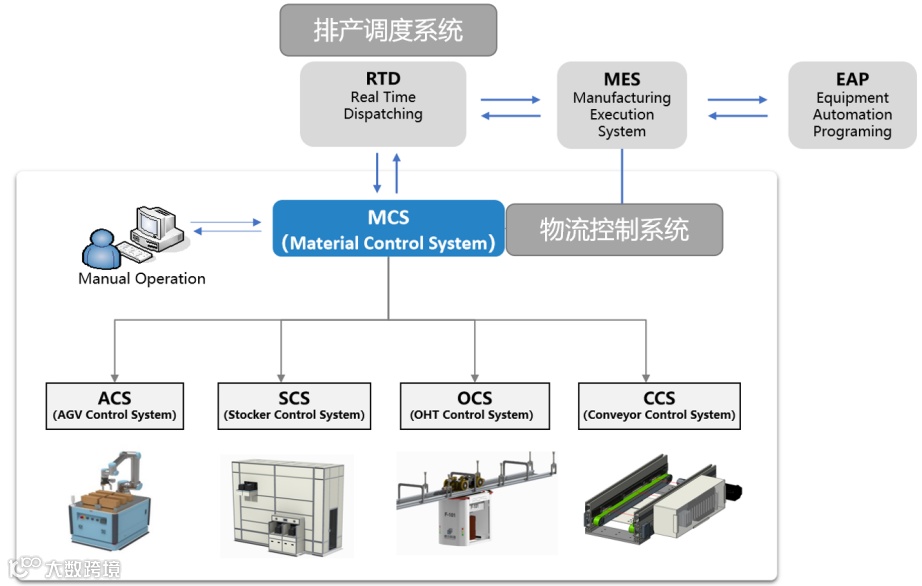 AMHS系统中,软件控制系统是核心,包括MCS物料控制系统和各物料搬运设备的控制系统,MCS系统需要对接上层制造CIM (Computer Integrated Manufacturing)半导体工业软件系统,包括MES制造执行系统、RTD排产调度系统、EAP设备自动化方案等,实现搬运指令的下达和实际搬运状态的数据上传,MCS通过对多类别的物料搬运设备控制系统进行统合控制和调度,再由各搬运设备的控制系统分别调度各搬运设备,实现AMHS系统的整体运行。