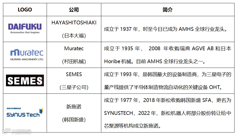 外企垄断。目前半导体AMHS行业的全球市场主要被日本大福、日本村田机械、韩国三星子公司SEMES等公司垄断。新兴的国产AMHS厂商进入半导体领域有极高的门槛,这是由于晶圆厂的AMHS系统一旦出现故障将会影响整体产线的运营,会造成巨额损失(单日损失上千万美元),目前阶段晶圆厂出于谨慎原则较难选用国产AMHS厂商。