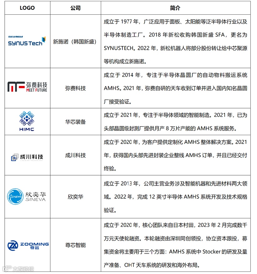 国内晶圆厂在与大福、村田等进口天车供应商合作时面临技术支持不及时,交期长,价格高等问题,国产替代势在必行。以国家大基金为主的半导体产业扶持战略,助推了一批新兴国产AMHS供应商的成长。但半导体行业出于谨慎考虑,目前国产AMHS天车方案仅在晶圆厂测试线或局部线运行,像华芯装备以及成川科技皆于2021年攻克先进封装领域的AMHS项目,弥费科技和欣奕华则是2022年取得8寸-12寸晶圆厂项目的阶段性进展。随着国产AMHS天车方案的成熟,若任意一家取得标杆性的整厂国产替代,在中国AMHS市场将有较为明显的优势,有望成为国产AMHS第一股。