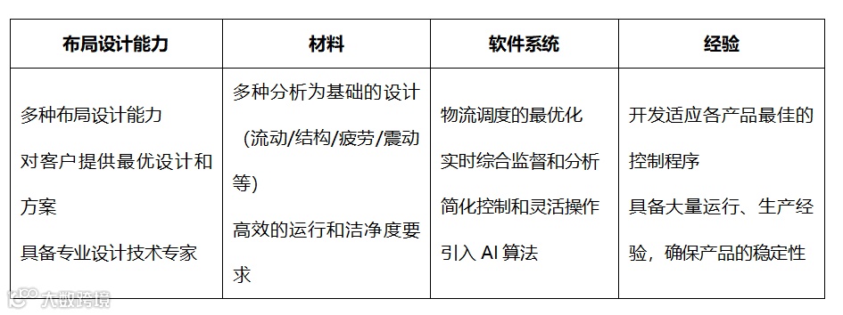 AMHS对布局设计能力、材料、软件系统、经验等都有较高的要求。对于布局设计能力,根据晶圆厂的不同设备特性和工艺流程,结合设备产能,物流装备数量等因素综合考虑选择对应的物流装备,灵活的布置传送带、轨道实现最优方案,专业设计必不可少。对于材料,OHT高速行驶仍保持洁净度要求,材料分析必须考虑振动数据、移载速度、承重能力等影响因素,材料决定产品质量。对于软件系统,软件是AMHS的核心,通过算法优化可减少闲置车辆,规划最优路线,预防交通拥堵,仿真验证超大规模的自动化控制,实现综合效率最优。对于经验,AMHS是晶圆厂的生命线,稳定性是硬指标。唯有大量运行、生产积累经验,确保产品万无一失,才能真正成为可靠的AMHS供应商。